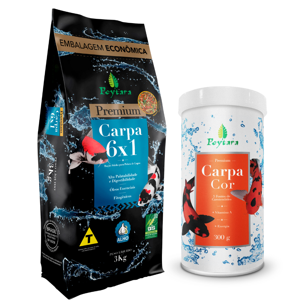 ALIMENTAÇÃO COMPLETA PARA CARPAS, KOI E PEIXES DE LAGO. AS DIFERENTES CORES ESTÃO BASEADAS EM INCLUSÕES DE INGREDIENTES FUNCIONAIS, REPRESENTANDO AS DIFERENTES NUTRIÇÕES E CUIDADOS. - Formulado com prebióticos, alho e óleo essencial de alho. - Auxilia na imunidade, bem-estar e saúde dos seus peixes. - O melhor Custo x Benefício para o seu lago. INDICAÇÕES: Poytara Carpa 6x1 é um alimento completo, formulado para atender às necessidades nutricionais e suprir a manutenção diária das carpas, Koi e peixes de lagos, que possuam hábito alimentar similar ao das carpas, com níveis adequados de nutrientes promovendo um bom crescimento e saúde para os peixes. É o melhor custo x benefício para seu lago. Possui em sua formulação prebióticos, alho e óleo essencial de alho auxiliando na imunidade, bem-estar e saúde dos peixes. Em formato de sticks (13 mm de comprimento e 5 mm de diâmetro), estimula a curiosidade e o apetite, com baixa densidade garantindo uma maior flutuabilidade. As diferentes cores estão baseadas em inclusões de ingredientes funcionais e representando as diferentes nutrições e cuidados. - Formato de sticks flutuantes - Comprimento de 13 mm e 5 mm de diâmetro - Auxilia o bem-estar - Ingredientes nobres - Possui alta palatabilidade e digestibilidade - Óleo essencial de alho - Realce nas cores - Com alho - + Vitamina C MODO DE USAR: Sugerimos que ofereça Poytara Carpa 6x1 de duas a três vezes ao dia, em quantidade suficiente para o completo consumo em poucos minutos, ou até que cesse a voracidade dos peixes. Em caso de sobras de ração no lago, sugerimos que faça a remoção para que não haja alterações nos parâmetros da água.